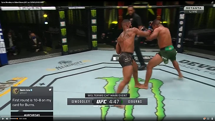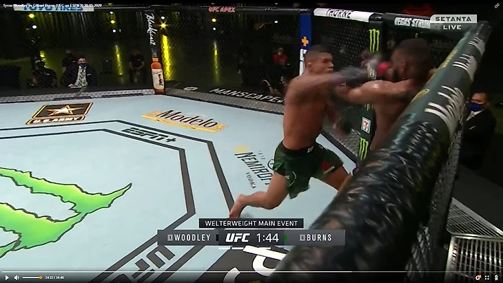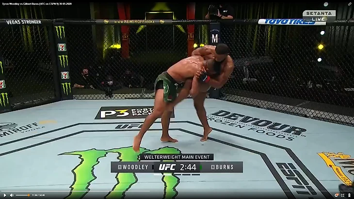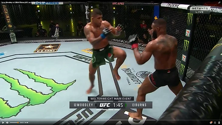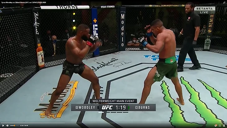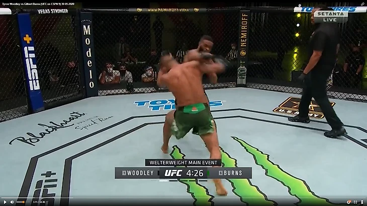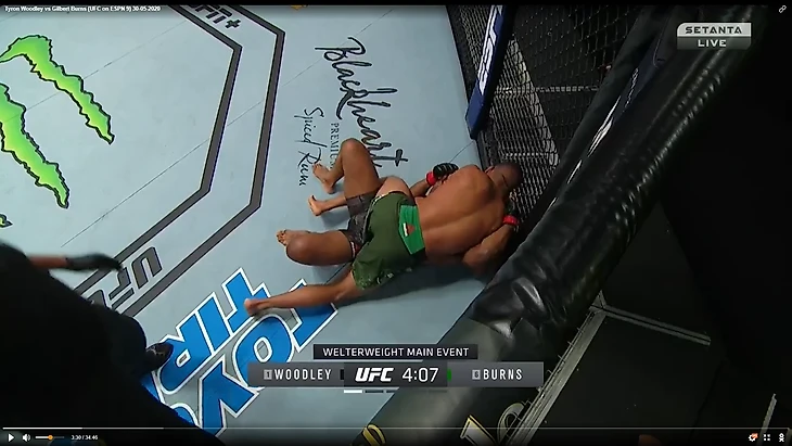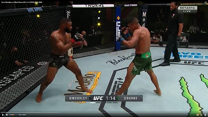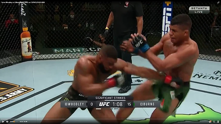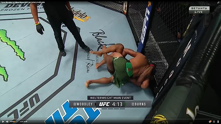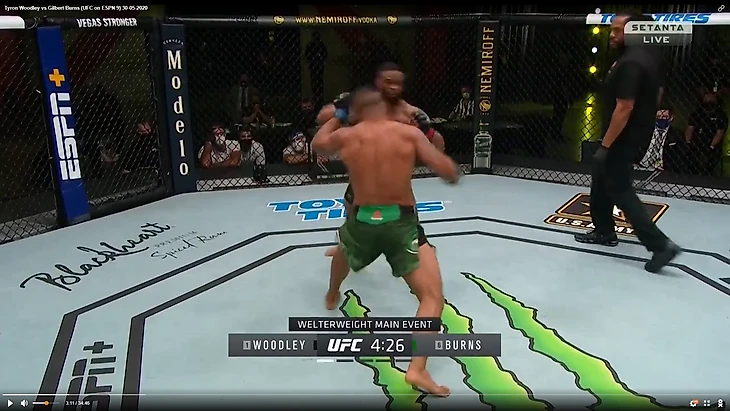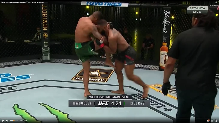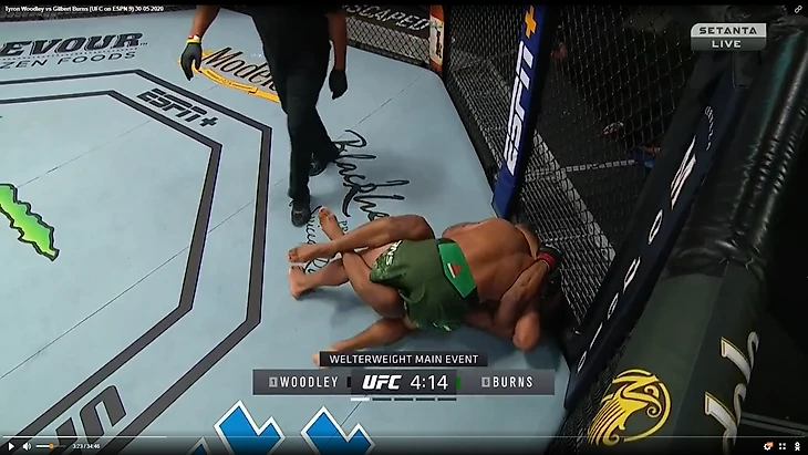 В один прекрасный момент Вудли рывком выбрался из партера и бой продолжился в стойке. И тут в голову сразу стала приходить аналогия между этим боем и предыдущим боем Тайрона Вудли. Как вы помните, бывший чемпион весь бой пятился назад от прессингующего Усмана. Причем отходил он, не пытаюсь менять углы, а просто по прямой. Ситуация повторилась снова. Пятисекундный момент на скриншотах снизу закончился атакой Бернса.