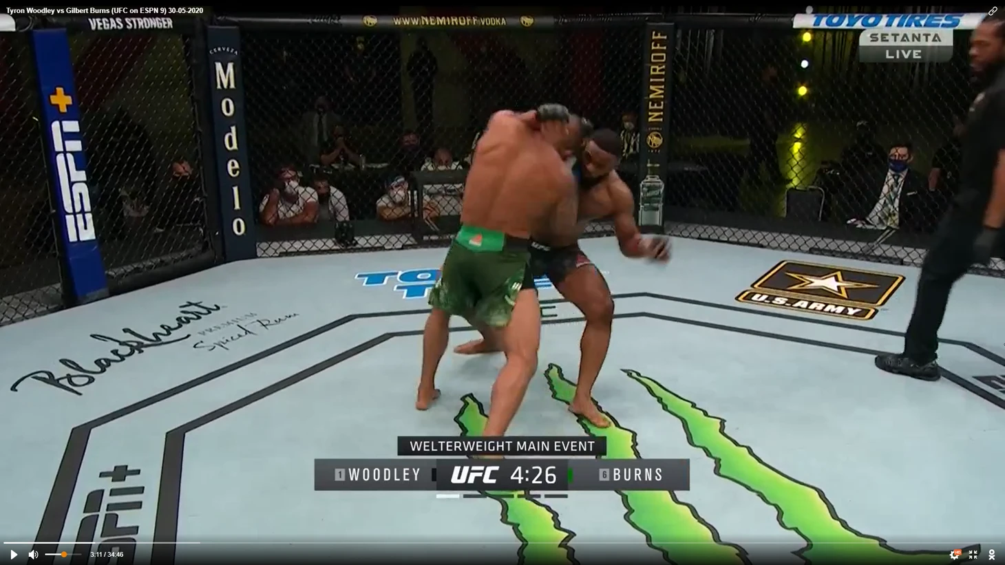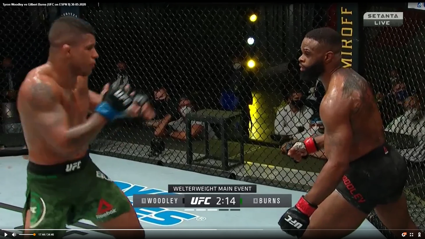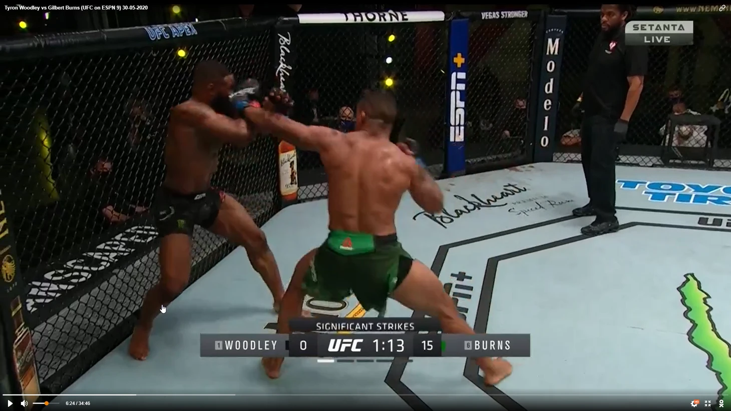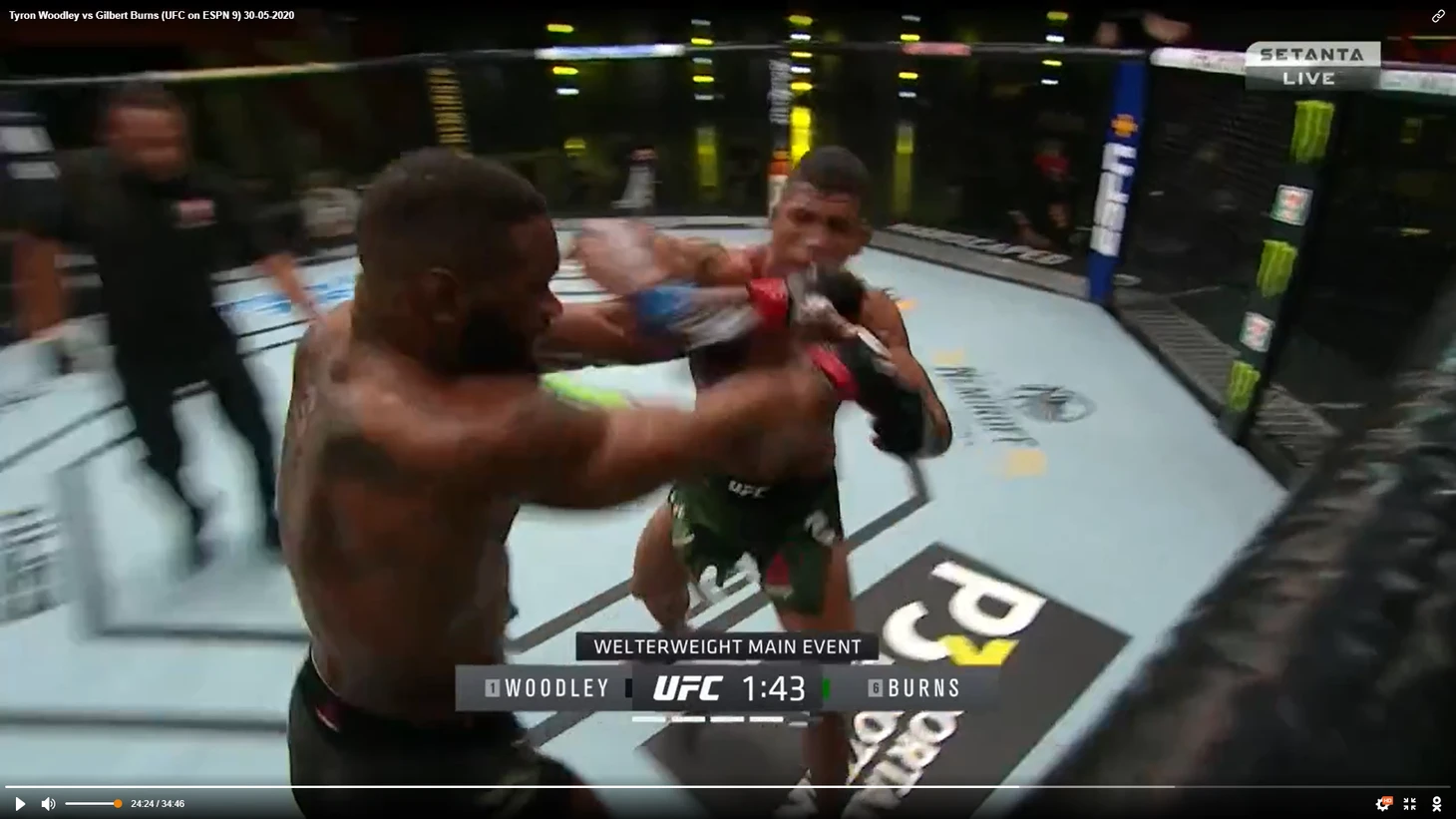 В один прекрасный момент Вудли рывком выбрался из партера и бой продолжился в стойке. И тут в голову сразу стала приходить аналогия между этим боем и предыдущим боем Тайрона Вудли. Как вы помните, бывший чемпион весь бой пятился назад от прессингующего Усмана. Причем отходил он, не пытаюсь менять углы, а просто по прямой. Ситуация повторилась снова. Пятисекундный момент на скриншотах снизу закончился атакой Бернса.