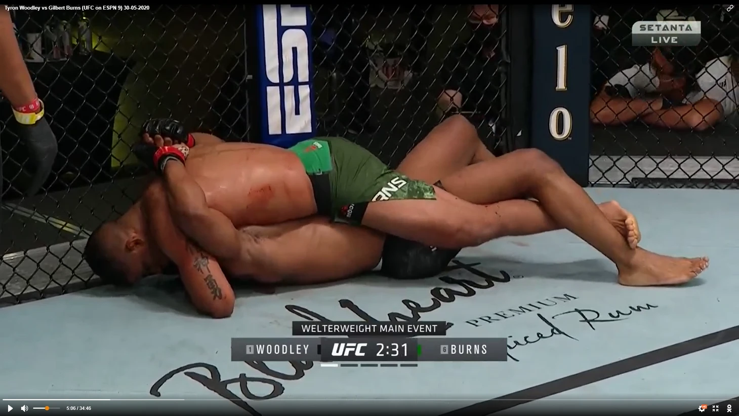 За этим последовал граунд-энд-паунд от Бернса плюс несколько неудачных попыток выхода на сабмишн. В конечном итоге, на протяжении пару минут Вудли не предпринимал попыток встать ноги, а просто-напросто прижимал бразильца.