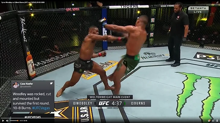 С каждым раундом интересных событий происходило всё меньше и меньше. Вудли всё реже и реже взрывался, а Бернс межденно, но верно «душил» американца. В 3 раунде в голову пришла мысль о том, что у Бернса есть недостаток в виде клинча и работы у сетки. Камару Усман показал, как он способен разбивать оппонента в этом компоненте (см. бой Вудли – Усман). И если Гилберт встретится с ним, то ему придется серьёзно поработать над защитой в таких ситуациях боя. То же самое относится и к Колби Ковингтону, при условии, что бразильцу дадут именно его. 3 раунд можно описать одним скриншотом – Тайрон Вудли ждёт.
