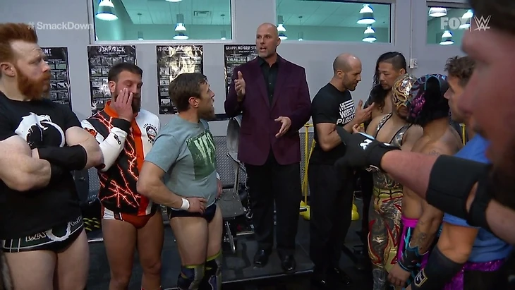 После анонсов и реклам настало время для разборок между бывшими участниками уже прошедшего баттл-рояла в начале шоу...