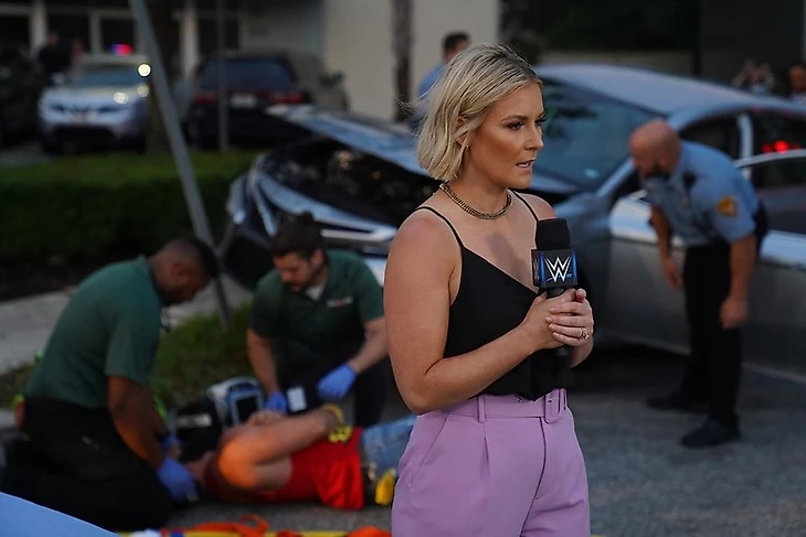 Однако, видимо, зря я накаркал. Выпуск по сути открыла ситуация около Подготовительного Центра WWE - Рене Янг находилась у места ДТП, в котором прилично пострадал...Элайас, участник полуфинала в турнире за вакантное интерконтинентальное чемпионство WWE. Также и Кайла Брэкстон пыталась узнать о данных событиях у чемпиона Вселенной WWE Брона Строумена. И пока "Монстр среди чемпионов" пытался рассказать о том, чему он стал свидетелем, группа сотрудников WWE с местными полицейскими нашли Джеффа Харди, которому принадлежит разбитый автомобиль (точнее - арендованный автомобиль, но в найденных документах аренды фигурировало имя "Энигмы").
