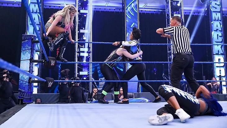 С трудом придя в чувство, Блисс зарядила серию клоузлайнов и дропкиков - Бэнкс и тут выдержала напор, проведя 2 метеоры с разных позиций в углу, но удержание снова до 2. Алекса не сдавалась и ушла от Banks Statement путём сворачивания, а связкой из хуррикераны и elbow smash-панча практически подвела ситуацию к Twisted Bliss. Бэйли почувствовала жару и пошла помогать Саше, чему пыталась помешать Кросс - попытка оказалась провальной, и Блисс получила running knee. Дело оставалось за малым, и сворачивание потерявшей сознание Алексы стало делом пару секунд - Блисс была удержана до 3 Сашей, и, судя по всему, бывшие женские командные чемпионки получили своё в виде тайтл-шота.