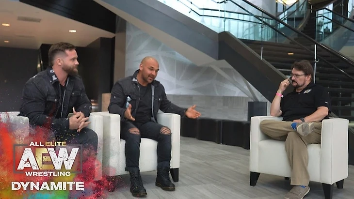 Далее мы перешли к интервью, которое Тони Шивони взял у FTR, совершивших свое первое появление в AEW неделю назад. Первым вопросом было, что стоит за аббревиатурой «FTR». Рестлеры отметили, что это не просто кетч-фраза, которая круто смотрится на мерче, это принцип по которому они живут. Эта фраза может означать Fear The Revolution или Follow The Rules, либо еще что-то подходящее, в зависимости от ситуации. Но так как они сейчас выступают в революционном AEW, Fear The Revolution более подходит именно сейчас. Тони назвал их одной из лучших команд в мире и спросил, есть ли список тандемов, с которыми они хотели встретиться на ринге. Они назвали чуть ли не весь командный ростер, кроме Young Bucks. Интервьюер обратил на это внимание. Они отметили, что не считают потенциальный поединок с Ником и Мэттом дрим-матчем. Да, Young Bucks — титулованная команда, которую обожает Дэйв Мельтцер, но FTR на это как-то все равно. Они не хотят показать лучший в истории матч с Young Bucks, они хотят просто дать им по лицу. Зачем тогда они спасли Джексонов от Бутчера и Блэйда? Потому что они хотят, чтобы Ник и Мэтт были целы и невредимы и подошли к матчу с FTR в своем лучшем состоянии. И когда они победят Young Bucks в лучшей их форме, тогда Тони и его коллеги комментаторы должны будут извиниться за то, что все эти полтора года называли Джексонов лучшей командой в мире. Тони поблагодарил их за интервью, которое можно было бы уже закончить, но тут в этом же самом холле появились Бутчер и Блэйд, которые стали предъявлять претензии. Тут же появились какие-то чуваки из неоткуда, которые остановили команды и не дали им подраться прямо здесь, а FTR попытались успокоить нажитых совсем недавно врагов: ничего личного, только бизнес. Именно руководствуясь своими бизнес-интересами они сделали то, что сделали неделю назад. Но если для Бутчера с Блэйдом это настолько личное, почему бы не решить все вопрос в ринге? На том и порешали. Напоследок Кэш бросил в оппонентов бутылку с водой.