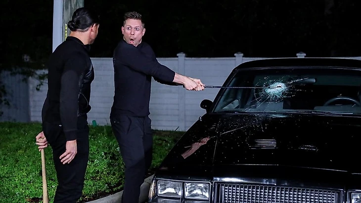 — Миз и Моррисон тем временем разбивают лобовое стекло машины Брона Струомана.