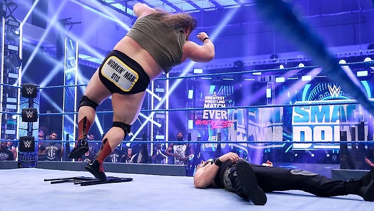 В начале матча Корбин несколько раз был отправлен за пределы ринга. Но там он смог запустить Отиса в рингпост и перенять инициативу. Вернувшись на ринг, Король умудрился провести спайнбастер. Далее он принялся обрабатывать панчами торс своего оппонента, после чего запер в слипер холд. Мистер Money in the Bank смог выбраться из захвата и провести серию эксплоудер суплексов. После очередного здоровяк вышел на Caterpillar, но Корбина выкатился за ринг, где взял стул и атаковал им Отиса. Послы пары ударов, Король был отправлен угол, где получил бади пресс и за ним Caterpillar.