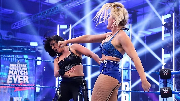 Соня напала на свою оппонентку ещё во время её выхода, толкнув Лэйси в стальные ступеньки. В начале матча инициативой, однако, завладела именно Эванс, которая провела спрингбоард элбоу дроп. Соня смогла противостоять бывшему морпеху, проведя ей биг бут и начав душить об канаты, а также наступая на волосы. Лэйси смогла ей ответить несколькими ударами колена на апроне и попыталась свернуть оппонентку, но обе столкнулись случайно с рефери, травмировав его ногу, в результате матч ушёл на перерыв. После возвращения с рекламы уже с новым рефери нам показали, как Девилль вернула инициативу с помощью своих киков. Так Соня проводит некбрейкер оппонентке об колено с апрона, а затем ногой прижимает её к ступеням горлом. Уже на ринге леди начинает комбечить, проводя серию клоузлайнов и киков и завершая её мунсолтом, но победить не удаётся. Она пытается провести некбрейкер, но ММАшница выкручивается и проводит пару ударов локтём, после чего добивает оппонентку ударом колена с разбега, но не до трёх. В этот момент на титантроне появляется Мэнди Роуз, которая заявляет, что Соня не боец, а неудачница. Девилль начинает кричать на бывшую подруг, как вдруг получает Woman's Right и проигрывает в матче.