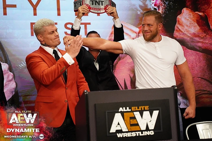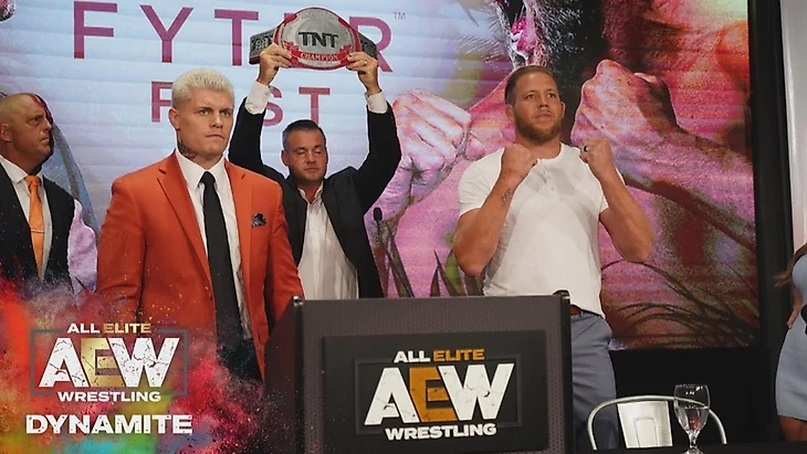 Следующий вопрос обращен к Коди – репортеру интересно, каково это, быть первым Чемпионом TNT. Роудс отвечает, что это означает давать надежду людям, вроде Рикки Старкса, который до прихода на DYNAMITE имел на своем счету около 4 долларов, но, покидая шоу, он знал, что у него появилась работа. Роудс известен как Американский Кошмар, но он все еще верит в Американскую Мечту – и это тоже надежда. Он воспринимает рестлинг очень серьезно, рестлинг подпитывал его всю его жизнь. Не мат-рестлинг, не игра в рестлинг, не косплей-рестлинг – про-рестлинг. Коди любит сражаться, чувствовать свою кровь, шлепки соперников по его ноге, когда он фиксирует figure four. Услуги, которые их промоушен предоставляет, транслируя про-рестлинг по ТВ – это надежда. Еще один символ надежды – этот незаконченный чемпионский пояс, говорит Роудс, указывая на пояс Чемпиона TNT. Только-только Коди разогнался с объяснениями того, как турнир за данный пояс помог AEW пережить Карантинную Эру, как в зал явился дорогой гость Джейк Стронг с супругой. Справившись у Коди о его готовности, претендент вплотную приблизился к нему, и мы лицезрели кадр в духе подводки к титульным боям в UFC. Джейк решил подшутить над Роудсом и приблизил кулак к его подбородку, чтобы на фото казалось, будто он вырубает его. Коди стерпел ровно две секунды, а затем агрессивно отвел руку Хагера в сторону. Тем не менее, потасовки не получилось: Коди не дал своим людям вступиться, а Джейк отошел на свою половину, а затем и вовсе покинул зал. Вице-президент AEW же объявил об окончании пресс-конференции.