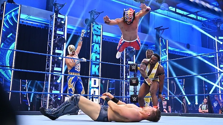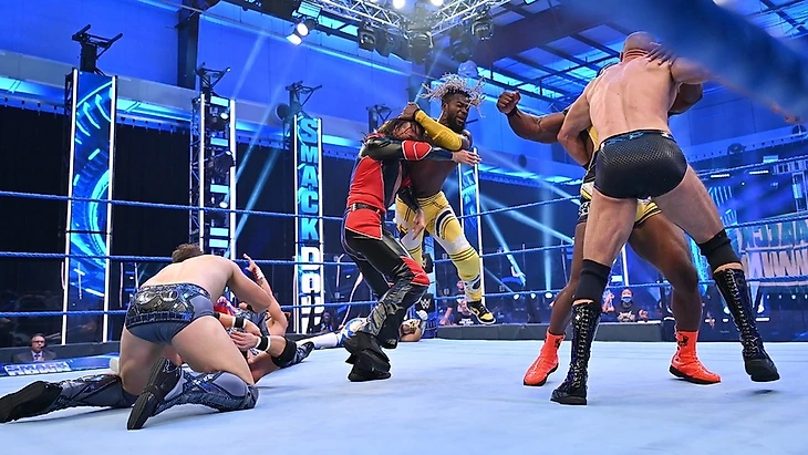 Начался бой с активного Биг И, требующего Сезаро и Накамуру в ринг - Миз же попробовал атаковать со спины через ринг. А получил в итоге коронный сплэш от Биг И на апроне, после чего отдал тэг Линсе Дорадо - тот повторил манёвр Ар-Труфа с Макинтайром с прошлой недели, но удержание вышло до 2. Против Линсе вышел Сезаро и борьба обрела приличные скорости - попытка сворачивания для лучадора снова вышла до 2, а после хуррикераны и Гран Металик стал подключаться в процесс. Однако он же и получать стал от Сезаро сытных люлей, точнее апперкотов - смена тэга и Накамура пытался удержать Металика на месте. Ещё одна смена тэгов и на ринге оказались Кингстон с Моррисоном - Кофи держал инициативу, до момента провального удержания и энзигири от Джона у канатов. В итоге Кингстон выпал с ринга и получил дозу грязной работы от хилов, а именно от Накамуры и Сезаро - на ринге они же практически ослабили Кофи апперкотом и лоу-киком, подначивая фейсов.
