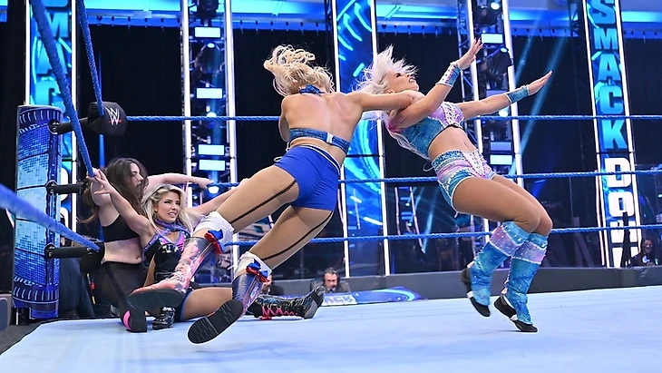 Бой начался с командных выпадов и попытки непонятного общего удержания. В итоге Кросс и Блисс стали работать в команде, чтобы получить возможность биться друг против друга - Эванс и Брук были нейтрализованы, но Никки проявила инициативу и чуть было не свернула Алексу до 3. Подруги поняли, что им придётся биться между собой и вроде как начали это делать, если бы не Лэйси - последняя стащила Блисс с ринга и Кросс осталась одна против Эванс и Брук. Никки бросилась на Лэйси и Дана освободила Эванс от потенциального слиппера, проведя следом corkscrew-метеору от канатов - удержание было сорвано Лэйси и дамы стали спорить. Кросс пыталась атаковать обеих сразу и атлетичным блондинкам пришлось отвлечься друг от друга.