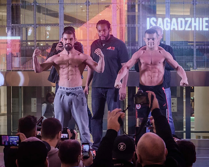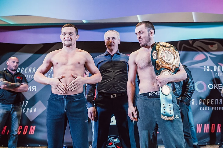 14 апреля 2017 года. Москва. Россия. Один день до реванша с Магомедом Магомедовым. На взвешивании Петр показывает всем свой живот. Изначально встреча планировалась на 22 октября 2016 года, но поединок перенесли из-за травмы Петра.