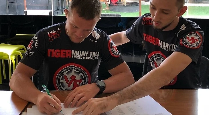 30 января 2018 года. Таиланд. В ноябре 2017 года он оставил титул чемпиона ACB ради перехода в UFC и через два месяца уже подписал контракт с лучшей лигой мира. Справа от бойца менеджер Сайт Абрахманов.