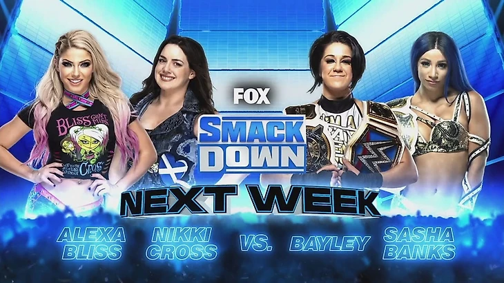Праздник продлился бы ещё дольше, если бы не появление Алексы Блисс и Никки Кросс - те решили показать какая у них крутая...фантазия: к примеру мисс Кросс оказывается королева целой Шотландии и метит на место Елизаветы II, а Блисс смогла перейти через всю Антарктиду как чемпионка WWE. Суть была в пустоте самовосхваления Саши и Бэйли, на что Бэнкс парировала...отсутствием такого же красивого видео, как примеров для подражания!!! А Кросс, перебив Блисс, указала на то, что хоть у Бэнкс и Бэйли есть куча трофеев и достижений - это лишено смысла, так как у обеих нет сердца и души. Так что Никки пойдёт на всё, лишь бы победить Бэйли и тем самым доказав свою правоту о Бэйли. Смех последней с Сашей спровоцировал Алексу на удар по лицу Бэйли, а Саша от возмущения пошла ещё дальше - от лица женской чемпионки SDLive бросила вызов Блисс на очный поединок прямо сейчас.