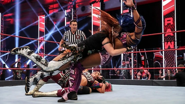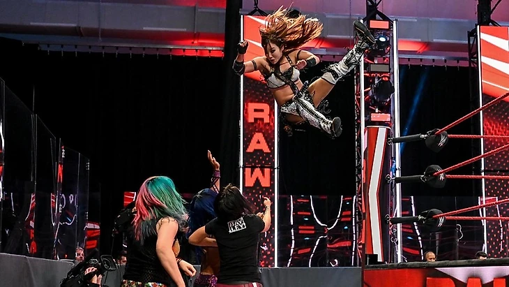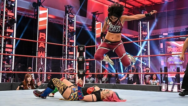 Дамы сразу бросились друг на друга и Бэйли взяла инициативу на себя, но потом Аска стала перехватывать инициативу. Борьба всё-таки начала обретать серьёзные обороты и на рингсайде - причём Бэйли позволила себе спровоцировать Никки и после небольшой потасовки Кросс увели от комментаторов, а Бэйли словила импровизированный GTS от Аски. После рекламы именно чемпионка RAW держала контроль в матче - кики японки имели свой эффект, только вот и Бэйли проявила смекалку в ответственный момент. Она перехватила инициативу, стала травмировать руку Аски и даже сбросила её с угла tornado-армдрагом, нанеся следом несколько новых критических ударов по Аске, но все попытки удержать японку провалились на ровном месте. Вскоре Бэйли решила надавливать на Аску хэдлоком - попытка не удалась и пришлось отвечать на удары с колена своими такими же. Из-за этого Аска была сброшена с ринга и чуть было не попалась под руку Саши - Каири быстро блокировала той путь и оппонентки оттащили своих сопровождающих друг от друга. В последний момент Бэйли сделала выпад в виде своего дропкика через угол ринга - он не попал в цель, зато Аска попала roundhouse-киком в Бэйли, однако удержание на ринге вышло до 2.