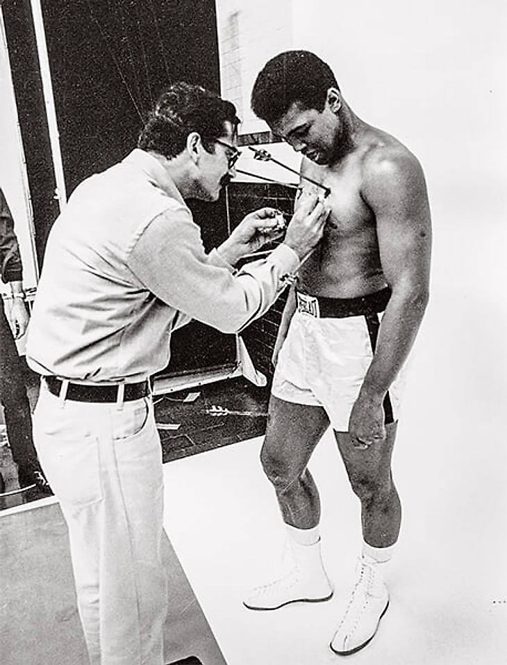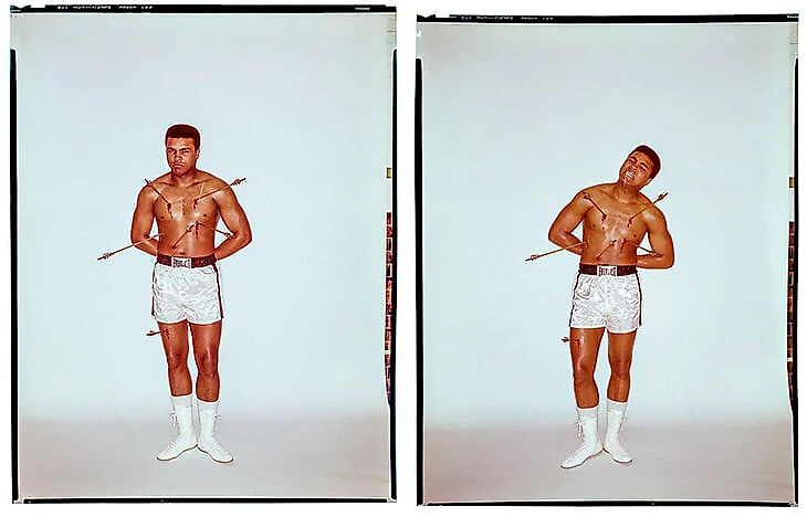 Для съемок Али облачился в привычный гардероб перед выходом в ринг: белые носки и боксерки, бело-черные трусы. Руки держал за спиной, якобы они связаны, взгляд – наверх, рот приоткрыт для идеальной подачи агонии. Отличие от картины Боттичини только в одном – одна из стрел была в бедре Мохаммеда.