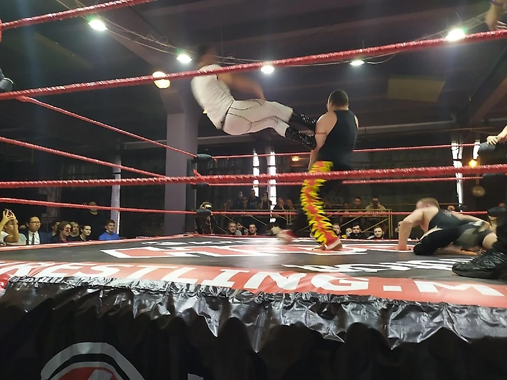 Grannary: На шоу не было жутко трудных приемов. Были очень жесткие приемы, но очень трудных не было. Тех же Spanish Fly, 450 Сплеш не было, хотя у нас есть исполнители, которые могут их делать. Я, может быть, зажрался, но был выход пару раз на Canadian Destroier, но в итоге он не был проведен. Хотя один подобный прием, и все бы были лежали в а..е еще минут 40. Рестлеры то ли сильно переживают, то ли не могут до конца довериться друг другу, чтобы провести серьезный прием.