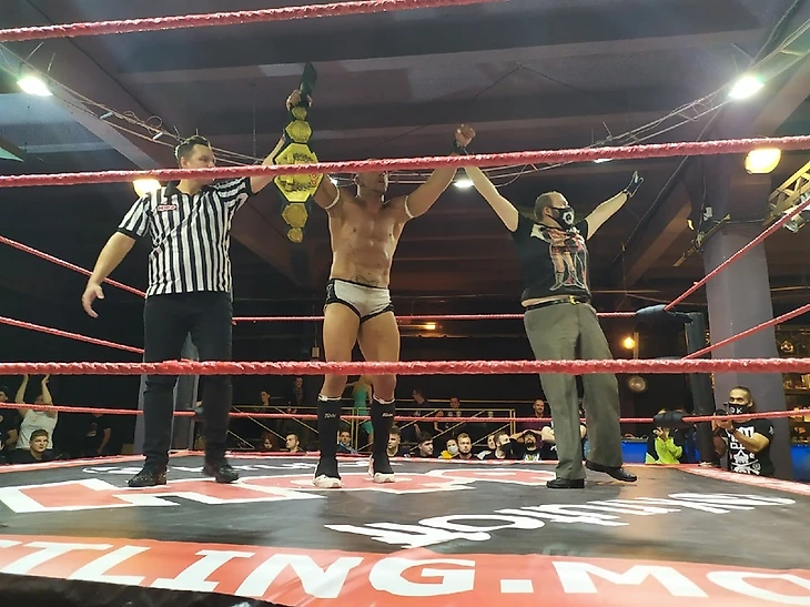 Начну с появления участников, так как удивили все. Я раньше видел выход Ликариона на Ударе, и…вживую выглядит, конечно, странно. Неоправданный пафос так и прет. А ведь сразу после выходит анимешный Гарри, который разрывает зал и кайфует от этого. Сложно воспринять выход Гарма, но от меня ему плюсик в карму за то, что вообще не обратил внимание на стороннюю реакцию, не смутился и невозмутимо провел матч. За это респект. Ну а Тим вышел в новой аттире и сразу повздорил с фанатами. Но когда он проходил мимо нас, то не дал пять Маше. А как говориться: «Маше пять не дал-инициативу потерял» ( прим. от Марии: Тим — правильный хил, сразу расположил толпу к себе), так что Ликарион атаковал чемпиона до гонга. Матч проходил быстро, у каждого исполнителя было время раскрыться. Но особо взрывных моментов не было, очень ровный матч. Были красивые приемы, например, Tornado DDT в углу, или комбинация Бульдога и Клоузлайна от Гарма, но прям «вау» моментов не было. К концу скорости выросли, и когда Тим уже был готов проводить коронный Разрушитель, Гарри кинул ему в голову стул, который отрикошетил в нас, так что когда мы подняли головы спустя пару секунд, то Свит уже был на втором канате и готовился к коронному Падающему Локтю. С первого раза он не получился, так как что-то произошло с канатами, но со второй попытки Свит все же поразил соперника и удержал до 3. Огромное ему спасибо за то, что решил не заканчивать матч на ботче, и за это первый титул за карьере ему и достался. А Тим в шоке остается сидеть в углу. Далеко не самая ожидаемая смена титула, интересно, что готовят Тиму.
