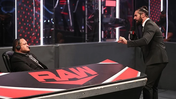 Нам даже не показали выходов рестлерш… Я уже говорил неоднократно, что обычно испокон веков в WWE скипали выходы джобберов. А тут, как бы две очень уважаемые рестлерши, которые оставили след в истории… Ну да ладно. Лана присутствовала на рингсайде. Для Микки это первый матч с момента возвращения. Сразу после гонга Джеймс отвлеклась на Лану, чем Нэтти воспользовалась. Длилось ее преимущество недолго, но стоило Микки провести пару киков и Lou Thesz Press, как Наталья вернула себе преимущество. Вновь ненадолго, и Джеймс провела пару атак, пошли вышла на коронный DDT, но канадка реверсировала, и дамы синхронно провели друг другу клоузлайны. Пока дамы приходили в себя, на арене появился Роллинс в сопровождении Мерфи и тут же в очень резком тоне стал спрашивать у Джо, откуда тот знает, про появление Мистерио-старшего сегодня. Сету было нужно знать, откуда у Самоа эта информация. Ну а Джеймс пока провела харриканрану, некбрейкер, стала забираться на канаты, но снова ее отвлекла Лана, забравшаяся на апрон, и Наталья сбросила жену Ника Алдиса на рингсайд. «Мессия» продолжал настойчиво пытаться узнать, кто является информатором Джо, а Микки не смогла вернуться в ринг до конца отсчета, так что проиграла. Лана стала снимать ее на телефон, но разозленная Джеймс провела ей суперкик и ушла. Ну а Роллинс сразу после этого взял микрофон и сказал, что раз Джо не хочет выдавать свои источники информации, и если у обоих Мистерио сегодня хватит наглости появиться на RAW, то он обещает, что ни один из них не доживет до SummerSlam.