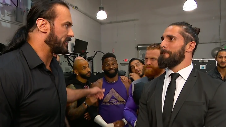 За кулисами половина раздевалки, очевидно, пыталась понять что произошло и строили теории о том, кто же все-таки эти парни из Retribution, а потом к ним подключился МакИнтайр, попытавшийся успокоить товарищей. Тайтус О’Нил спросил его, как себя чувствует Флэр, на что Дрю ответил, мол с Риком все хорошо. А вот кому не будет хорошо, так это Ортону на SummerSlam. Однако теперь вообще не понятно, дотянут ли они до SummerSlam, когда Retribution творят такую дичь. МакИнтайру не нравится когда толпа каких-то парней появляется на его шоу и делает все, что хочет. И сейчас у ростера RAW есть выбор: либо пусть каждый занимается своим делом и игнорирует то, что творится вокруг, либо все-таки всем нужно собраться и дать отпор. Вроде бы, все поняли, что выбирать нужно второй вариант, и даже были готовы уже начать действовать, но тут появился рассмеявшийся над всем этим Сет Роллинс с Мерфи. Роллинса насмешили попытки Дрю повести за собой раздевалку, ведь на RAW уже есть мессия и лидер, так что в услугах МакИнтайра никто не нуждается. Шотландец ответил, что слышит эти речи о лидерстве от Сета уже лет 5, и за все эти годы он так и не повел за собой людей. А значит они не пойдут за ним и в борьбе против «Retribution».