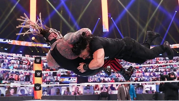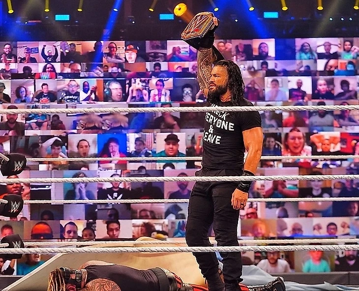 Однако после матча случился неожиданный сюрприз - "Изверг" подвергся мощной атаке со стороны... вернувшегося в строй Романа Рейнса. "Big Dog" вернулся на громогласной ноте - и под его горячую руку попал не только новый чемпион, но и бывший чемпион. Не только под руку, но и под стул с серией гарпунов, после чего топ-звезда синего бренда и 4-кратный мировой чемпион WWE попозировал с титулом Уайатта.