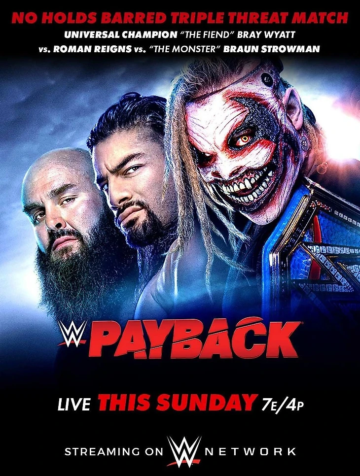 "Изверг" Брэй Уайатт (ч) против Романа Рейнса против Брона Строумэна - матч без ограничений за Вселенское чемпионство WWE.