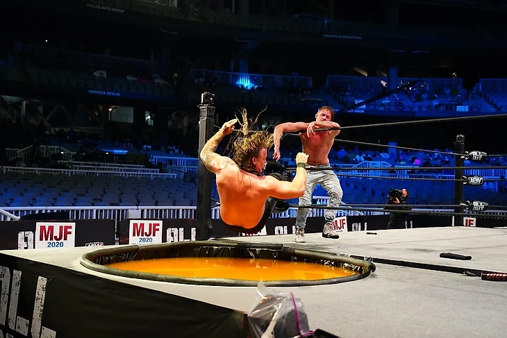 Ну да ладно, не стоит о грустном, ведь впереди – развязка самого сочного фьюда этого года. Крис Джерико, Орэндж Кэссиди, 80 галлонов Мимозы, предмэйн главного PPV от All Elite… ну, вы поняли. Перед началом Крис Джерико дал небольшое ворк-шут-интервью Алексу Марвезу, в котором назвал весь фьюд с Кэссиди экспериментом, призванным установить, способен ли Джерико создать полноценного мэйн-ивентера для AEW. Ле Шампион уверяет, что способен, и за это мы должны поблагодарить его. Но не стоит забывать и о том, что Джерико не только создает звезд, но и убивает их. Эксперимент подходит к концу, Кэссиди падет от рук ДЕМО-БОГА. Кэссиди, как вы понимаете, комментариев не дал.