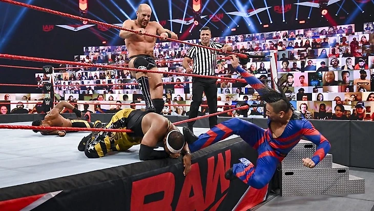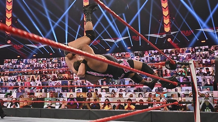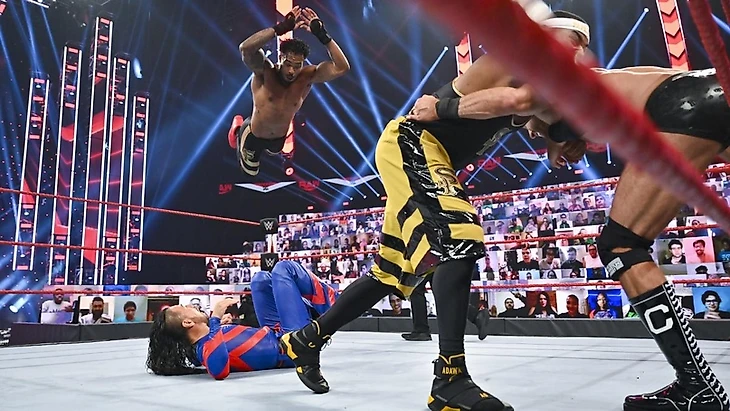 Во время выходов командных чемпионов SmackDown Форд пританцовывал под тему Накамуры (настолько она крутая в своей задумке, что даже оппонентов качает). Еще нам показали очень банальное промо от Шина и Сезаро, самой интересной частью которого стал рассказ о том, что швейцарец чуть баристу не убил, настолько он возненавидел Street Profits и все, что с ними связано, в частности кофе. Начался матч с того, что Сезаро наглухо вырубил Анджело своим апперкотом. Командная работа прошла до 2. Достаточно буднично командный чемпион RAW отбился, и вот уже японец пал жертвой команднйо работы, удержание после которой разбил Сезаро, попав за это под двойной дропкик. Дайв Монтеза международный альйнс прервал, обрушив его двойной бомбой на баррикаду, что позволило им перехватить инициативу. Всю рекламную паузу Форд страдал, а потом ушел от атаки в углу, и мы увидели смену составов. Анджело обрушил всю мощь своих атак и на японца, и на швейцарца, но только до 2. От атаки в углу Шинске ушел, проведя свою варицию спайдер суплекса, попав затем в спайнбастер. Тэг Форду, и тот приземлился своим фрогсплэшем прямо на колени Накамуры, после чего был удержан до 2, пока Докинс разбирался с Сезаро. Связка из Swing и коленей до 2, так как Анджело разбил пинфолл, за что получил жесточайший панч от Шинске. Пока Докинс страдал, его напарник пришел в себя, свернул Сезаро, однако только до 2, и сразу же получил жесточайший поп-ап апперкот до 2. Шин же тем временем не попал коленом по Анджело, угодив в стальные ступеньки. Тогда швейцарец обработал Монтеза апперкотами, попытался вытащить на коронный суперплекс, который прошел, однако Анджело успел перехватить у товарища тэг, сразу же шарахнув Сезаро фрогслэш до 3. Победа командных чемпионов RAW.