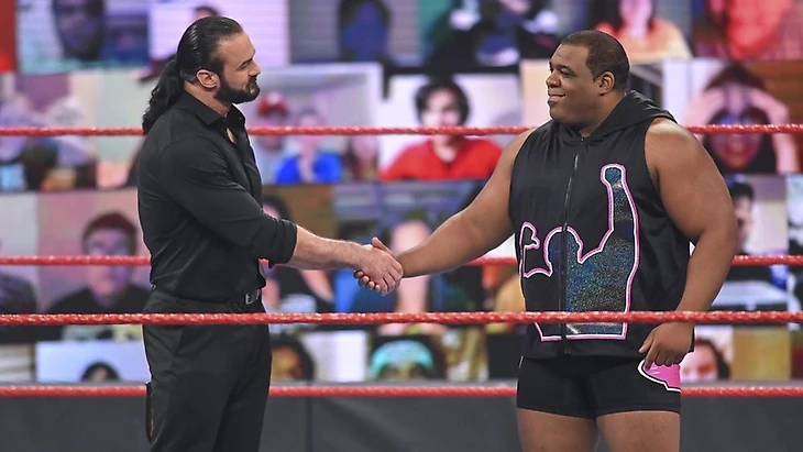 Ведь он получил аж 3 самых жестких удара во всей индустрии спортивных развлечений. Забавно, что МакИнтайр придумал Claymore по ошибке. Несколько лет назад, выступая на ринге WWE, он надел очень сковывающие движения кожаные трико, нанес сопернику кик в голову, и услышал, как его трико треснуло по шву. Конечно, ему как шотландцу должно было быть вполне комфортно, ведь на родине Дрю мужики в юбках ходят, но тем не менее он решил не показывать зрителям где именно его трико треснуло, и он решил импровизировать, вдруг поняв, что порванный шов не будет видно, если во время кика он поднимет обе ноги. И в этот самый момент он осознал, что придумал очень жесткий маневр, развив его в дальнейшем. Затем МакИнтайр, прямо как Ортон относительно недавно, показал картинку с жертвами Claymore (естественно, как и в случае с фотошопом от Рэнди все они находились в больничной палате): Роллинсом, Зигглером, леснаром, Биг Шоу, Лэшли и Ортоном в самом центре [до чего техника дошла, вашего Биг Шоу, и там, и тут передают… ну, в смысле, он попал на обе такие картинки]. Вдруг на арене появился Адам Пирс, сообщив, что до сих пор неизвестно, насколько серьезную травму получил Ортон. Также не известно, сможет ли он поправиться к Clash of Champions. И это меняет титульную картину. В общем, теперь, если Кит Ли сумеет победить Дрю сегодня, то именно он сразится с МакИнтайром на ближайшем PPV с титулом чемпиона WWE на кону. «Кто назначил тебя на руководящую должность?» — задал вопрос шотландец, когда Адам уже покидал стэйдж. Ну а к четырехугольнику двинулся сам Ли с улыбкой на лице. Рестлеры пожали руки, и вдруг Кит не захотел руку товарища отпускать. Немного гляделок, и шоу ушло на рекламу.
