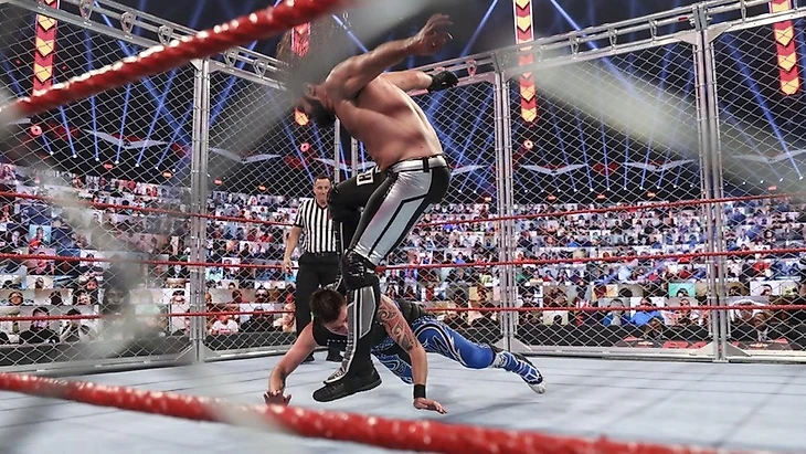 Мистерио, как и обещали, вышли с Домиником. Сет начал бой агрессивно, но попал под Russian Leg Sweep, после чего Дом тщетно попытался выбраться и шарахнул Роллинсу еще и DDT, но лишь до 2. Опять Мистерио попытался покинуть стальную конструкцию, но внезапно появившийся Мерфи просунул в ринг кендо стик, которым «Мессия» атаковал. Это позволило ему плотно захватить контроль. В какой-то момент Доминик реверсировал, направив Роллинса лицом в стенку клетки. А потом и вовсе перевел бакл бомбу в харриканрану все туда же — в клетку. Затем палку кенду уже Рей передал сыну, и тот обрушил весь свой гнев на врага. Это уничтожение завершилось сит-аут спайнбастером до 2. «Мессия» ответил катапультой в стальную стенку, однако Дом зацепился и пополз вверх. Сет полез за ним. После обмена оба «сели» на канаты. Доминик стал ползти к двери, Рей решил помочь ему, но на легендарного лучадора налетел Мерфи. Роллинс же затащил Доминика обратно, собрался сам выйти через дверь, но австралиец хлопнул дверью, видимо, думая, что рядом с ней все еще Мистерио-младший, а оказалось, что навредил «Мессии». Тут же он попытался как-то исправить то, что натворил, помешал Дому покинуть клетку, за что сам был обрушен на рингсайд со стальной конструкции. Ну а Сету достался фрогсплэш до 2. Снова Мистерио начал выбираться, но Роллинс сумел остановить его в самый последний момент, проведя суперплекс и фэлкон эрроу до 2. Тогда «Мессия» устроил гляделки с Реем, получив внезапное сворачивание до 2. Моментально он шарахнул Стомп. Еще один. Сет опять победил. Победитель покинул ринг, прихватив с собой палку кендо, а дверь открыл ему Мерфи с виноватым видом. Роллинс посмотрел на него, что-то стал гооврить, а потом отбросил палку, приобнял своего «послушника» даже поцеловал… и впечатал в баррикаду. Потом в клетку. Еще и дверью ему двинул, высказав свои претензии. Затем он подошел к жене Рея, сказав, что они «проделали невероятную работу», видимо, подразумевая, то, как они воспитали Доминика, однако выразил надежду, что из сестры Дома «выйдет что-то получше». Рей уже давно проверял состояние сына в клетке, а затем туда и жена с дочерью подоспели. Но перед тем, как зайти в ринг, дочь Мистерио проверила, как там Мерфи себя ощущает…