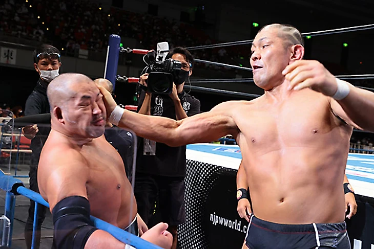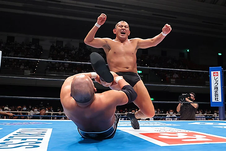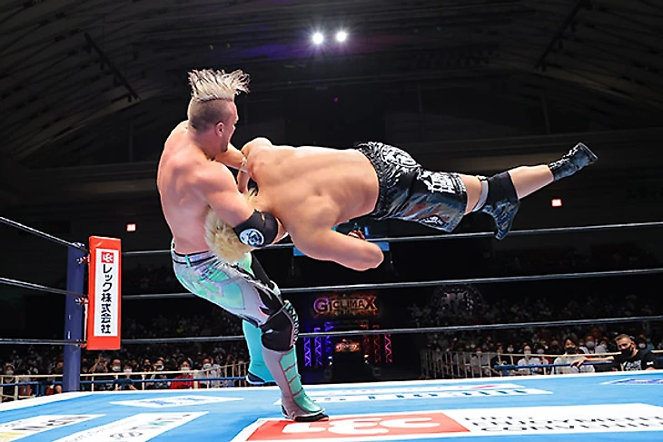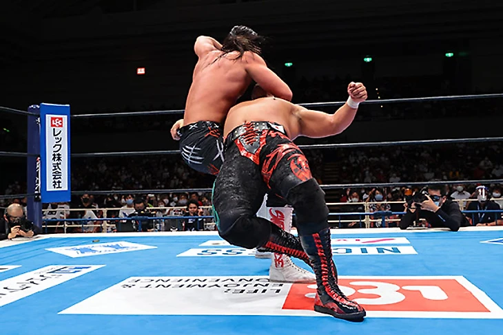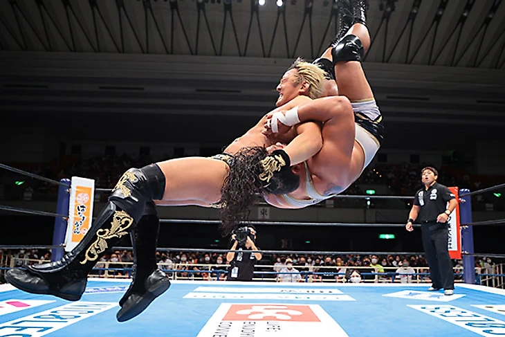 Надо отметить, что Джефф подрастерял форму, что в купе с седой бородкой, которую он отрастил, прибавило ему чуть ли не 7-10 лет визуально по сравнению с прошлым годом. Кстати, это третий матч между атлетами, до этого они встречались на Wrestling Dontaku и Climax 29 в прошлом году, причем оба раза победителем вышел представитель Suzuki-Gun. Поединок, который длился почти 13 минут, Таичи начинать особо не спешил, успев даже докопаться до молодого льва Гэбриела Кидда до того, как наконец изобразить какое-то подобие борьбы. Ранее преимущество осталось за американцем, а его дропкик и вовсе отправил «святого императора» за пределы четырехугольника. Ах, если бы Джефф знал, чем это для него в итоге закончится. Таичи взял молоточек, которым звонят а гонг и шарахнул по колено Кобба. Потом последовал болевой и использованием ограждения, что позволило командному чемпиону IWGP захватить преимущество и довольно долго сохранять его. От Axe Bomber гайджин ушел, проведя собственный лэриэт. Он позволил Джеффу зайти на серию неплохих атак, но в результате Таичи провел кик в углу, и бой почти вернулся в прежнее русло, пока попытку суперкика Кобб не встретил вариацией DVD, добавив то, что давние фанаты называют Gachimuchisault. Spin Cycle до 2, и Таичи вернулся с помощью очередного кика и бэкдроп драйвера. Axe Bomber стал неплохой почвой для Black Mephisto, но рановато, и Джефф зашёл на серию гатренч суплексов. Ещё один Spin Cycle подготовил почву для Tour of the Islands, однако Таичи ответил киком в прыжке, добавил суперкик и завершил матч фирменным Black Mephisto.