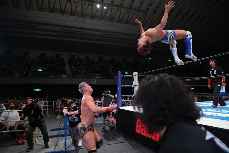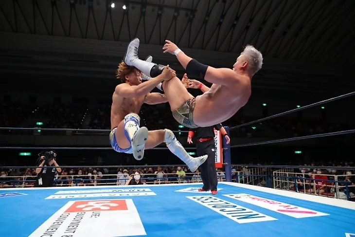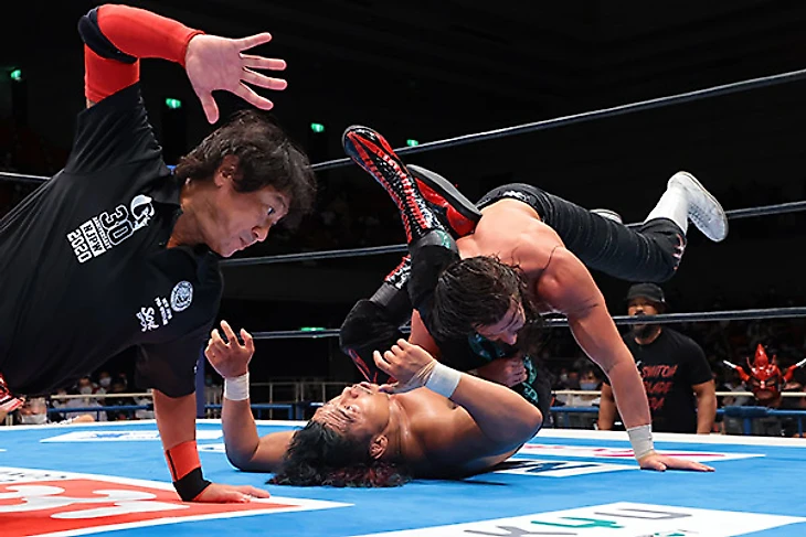 Если бы нам по традиции выдавали бы тонну командников с толпой людей в андеркарде, я бы, как и в прошлом году, не стал бы их обозревать прям досконально. Но одному бою молодых львов можно и уделить внимание. Парни получили около 7 минут и одним из самых заметных моментов стало то, что... Йота Тсуджи побрился. По классике парни обменивались базовыми захватами и атаками на старте, потихоньку переходя к более тяжёлой артиллерии. Этот переход был ознаменован довольно жёстким шоулдер тэклом от Тсуджи. Йуя ответил армдрэгом, парой болевых, но нарвался на бэк дроп и суплекс и вернуться в бой смог только, встретив попытку гарпуна дропкиком. Суплекс до 2, и Уемура захватил противника в бостонский краб, перейдя на вариацию Liontamer, когда Йота попытался дотянуться до канатов, из-за чего Тсуджи сдался.