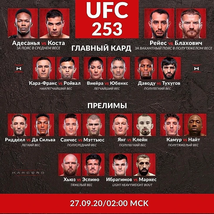 Утром 27 сентября в основном карде UFC 253 пройдут сразу два титульных боя: Исраэль Адесанья против Пауло Косты и Доминик Рейес против Яна Блаховича. Также друг и одноклубник Хабиба Нурмагомедова – Зубайра Тухугов – подерется против Хакима Доводу. с идущим на серии из четырех побед подряд Хакимом Доводу за место в топ-15 полулегкого веса.