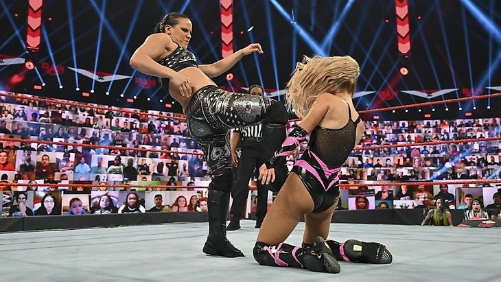 Во время Микки нам показали ее промо, записанное заранее, суть которого сводилась к тому, что неделю назад в бою с Аской она не сдалась, ну а что до Зелины, то сегодня ей предстоит подтвердить все, сказанное на прошлом RAW действиями. Начала бой Вега, тем не менее, довольно уверенно, пусть и грязно. Джеймс отбилась незамысловатым броском, потаскала Зелину за волосы и отбилась от слипера, проведя кик до 2. Суплекс Вега перевела в сворачивание, провела octopus hold, и Джеймс отбилась с помощью угла ринга, получив почти сразу бут в этом же углу. Второй Микки заблокировала, дамы обменялись сворачиваниями, немного борьбы, и еще один болевой от Веги, на этот раз у канатов. От Tornado DDT Микки отбилась, зашла на серию страйков, провела флэпджек и seated senton до 2. Коронный DDT же Вега реверсировала, отправив соперницу в канаты, провела бэкстэббер, и одержала победу.