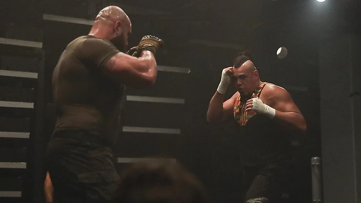 Здоровяки устроили обмен ударами, пошли в борьбу, Брон вышел на слипер, но Дабба отбился, и они выкатились за пределы ринга, где продолжили обмениваться ударами. Даже покидали какого-то чувака друг в друга. Вернувшись в ринг, Строумэн нанес несколько жесточайших ударов, и бой был окончен.