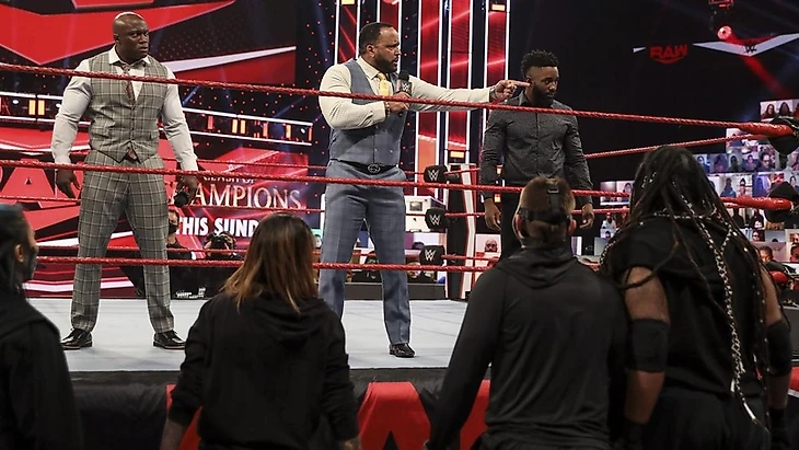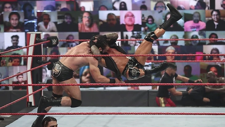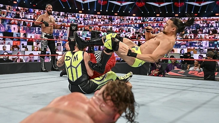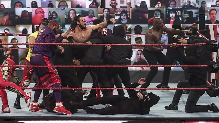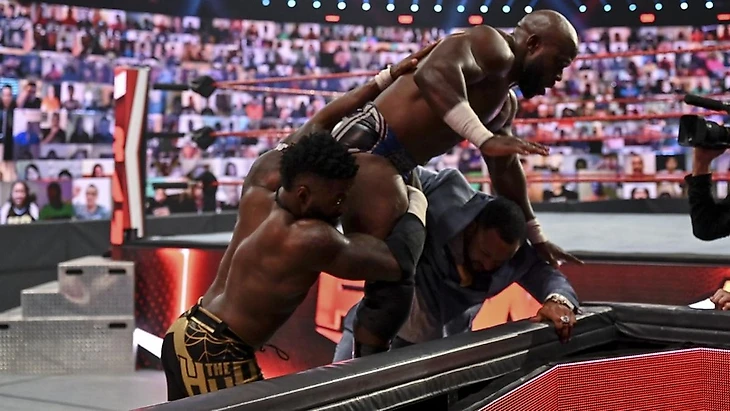 Знаете… В принципе, спасибо, что сегмент длился всего минут 5. Но в целом, с Retribution, боюсь, что все. Честно, я являюсь последним человеком на Земле, кто хотел бы, чтобы эта группировка провалилась. Я правда хотел верить, причем до последнего, что WWE сообразят для них что-то нормальное. Но нет, они появляются на RAW, зачитывают наконец промо, говоря все то же самое, что сказали на прошлой неделе, при этом, ругая рестлеров WWE и руководство компании, заключают по сюжету контракт с этим самым руководством, прям как эти самые рестлеры. Я уже не буду говорить про то, что мотивация, вроде «вы такие плохие, ведь вами движет желание заработать денег» в 2020 году не вызывает ничего, кроме ухмылки что ли. Это настолько банально и неактульно для нашего времени, что просто грустно. И все эта ситуация относится к группировке, которая появилась почти 2 месяца назад, и за это время можно было придумать что-то в 250 раз более оригинальное, чем вот это вот. Один плюс — на фоне Retribution группировка ЭмВиПи стала выглядеть прям круто. Но и тут сценаристы немного расстраивают, может быть, только меня. Да, когда на прошлой неделе The Hurt Business так козырно появились, прям как тестостероновые персонажи из боевиков сняли с себя пиджаки и пошли бить лица — это выглядело прям симпатично. Повторять точно такой же выход спустя всего неделю — как-то не знаю. Уже не то. Но это так, придирка, не более.