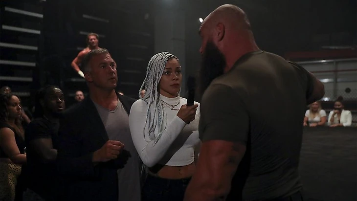 За кулисами The Hurt Business избили дамагеров из Retribution. Никого из лидирующей пятерки тут не было. Нам показали промо-видео о Бьянке Белэйр, в котором она была во всем лучше какого-то парнишки: в подтягиваниях, толчке штанги, ходьбе на руках… WWE, почему для того, чтобы показать девушку крутой, вам обязательно было унизить какого-то парня?