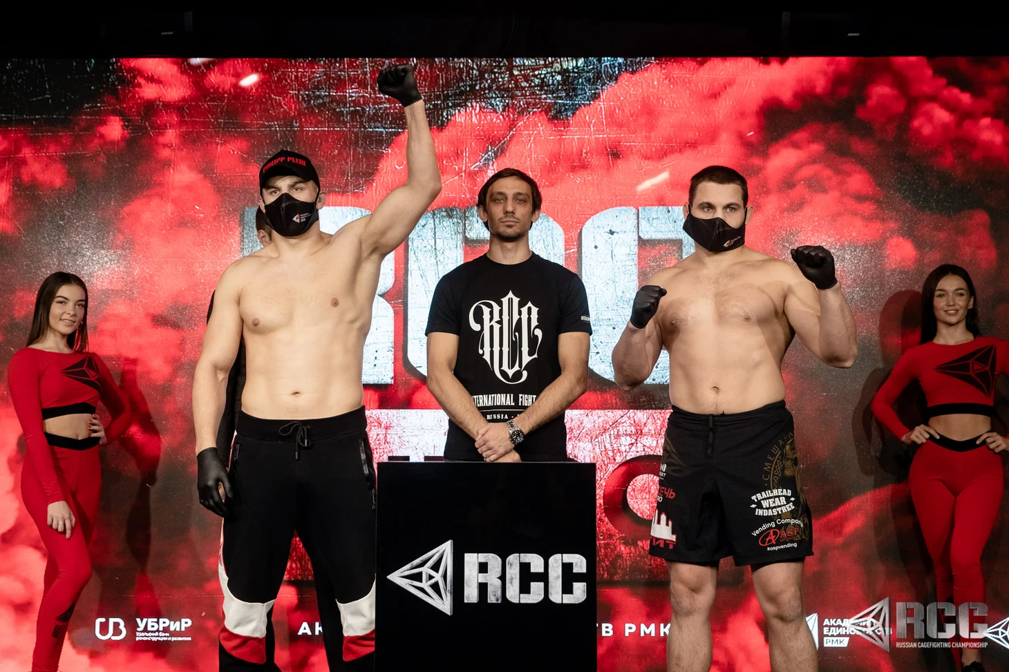 Завтра в главном поединке турнира RCC: Intro встретятся Михаил Рагозин и Дмитрий Тебекин. Бойцы только что встретились лицом к лицу и прошли взвешивание — Рагозин оказался легче соперника на 250 грамм и показал вес 93,15 кг.