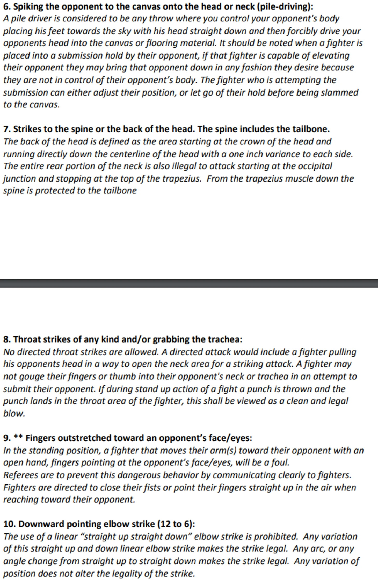 Запрещены именно направленные атаки по горлу, например, когда боец оттягивает голову оппонента, чтобы нанести удар. Бойцам также запрещено проводить удушение путём давления пальцами на шею или трахею противника. Если же нанесённый в стойке удар попадёт в область горла, то он считается легальным.