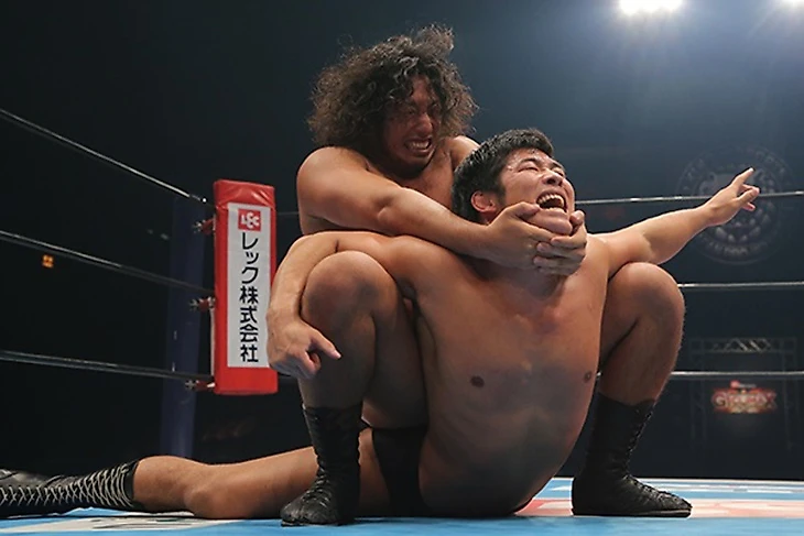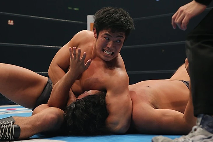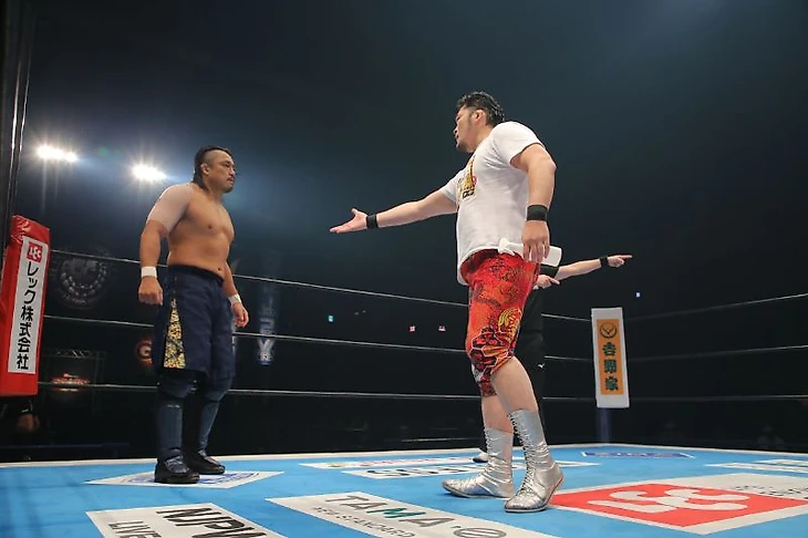 Четвертый матч этих двоих за этот тур. Начался он как обычно, правда в этот раз очень уж долго атлеты не спешили переходить от чейн-рестлинга к более активным действиям, проведя разве что только тэкл да слэм на двоих, что сразу же натолкнуло меня на мысли о грядущей ничьей. Вот парни перешли к чопам, и казалось бы, сейчас начнется движуха, но Тсуджи провел хип тосс и опять заключил соперника в болевой — на этот раз Camel Clutch. Еще немного реверсов болевых, снова брейк, и мы стали свидетелями еще одной битвы чопами, после чего Йуя провел слэм оппоненту до 2, а затем получил бэк бади дроп, добавив слэм, саммерсолт сентон и сплэш, применив бостонский краб, но Уемура дотянулся до канатов. Ответом стал дропкик в углу Йуи, за которым последовал слэм и бостонский краб, и Йота довольно долго страдал перед тем, как все-акт дошагать на руках буквально до канатов. Несколько неприятных ударов от раздосадованного Уемуры, который был уверен, что завершит бой болевым, и от оверхэд белли-ту-белли Тсуджи отбился, поймав затем противника гарпуном, и оба исполнителя решили отдохнуть. Ну а потом Тсуджи сумел выйти на бостонский краб, а времени до завершения боя осталось буквально 2-2 с половиной минуты. Йуя очень страдал, Йота все никак не выпускал его из захвата, но все-таки Уемура сумел доползти до канатов. В ходе последней минуты рестлеры принялись обмениваться жесткими ударами, Тсуджи попытался повести гарпун, но попал в сворачивание, на которое ответил собственным сворачиванием, казалось бы, верным, но временной лимит в 15 минут уже был исчерпан. В общем, у нас очередная ничья.