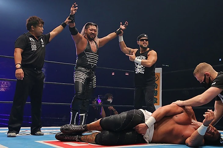 Третий матч этих двоих, причем предыдущие два в свою копилку забрал ИВИЛ. Представитель Bullet Club, конечно же, вышел в сопровождении Дика Того, и атаковал Джуса, когда тот раздевался. Рефери вместо того, чтобы оттащить ИВИЛА от соперника и спросить Робинсона, может ли тот начинать бой (ибо атака была до гонга), дал отмашку об официальном старте поединка. Впрочем, для NJPW это не в новинку. Американец отбился, провел кроссбади с третьего каната, несколько чопов, и Того зацепил его у канатов, вытащил за пределы ринга и атаковал, пока ИВИЛ отвлекал судью. Потом за отвлечение судьи взялся уже Дик, а ИВИЛ вытащил из под ринга стулья, побил Джуса и провел ему суплекс на эти самые стулья. Затем он вернулся в четырехугольник, снял защиту с одного из углов, добавив Робинсону еще один суплекс, на этот раз в ринге, до 2. Бостонский краб на одну ногу последовал, потом еще несколько атак, включая отправку в оголенный угол ринга, но спустя пару мгновений Джус отбился лег лэриэтом, добавив спайнбастер, и скинул Дика Того с апрона, полетев на него планчей. В ринге он шарахнул кэннонболл ИВИЛУ, провел кроссбади, но для победы этого не хватило. Фулл нельсон японец провести себе не позволил, провел кик в корпус с использованием рефери, но сентоном он промазал, а вот такой же прием Робинсона залетел прям четко. Еще несколько атак и суперплекс прошли, сразу за которым «Flamboyant» шарахнул джекхэммер до 2. Pulp Friction ИВИЛ получать не захотел, дотолкал спиной противника до канатов и зацепил рефери, позволив Того атаковать Джуса стулом по спине. Darkness Falls до 2, и Робинсон отбился от Everything is EVIL, не сумев вновь довести дело до победы коронным Pulp Friction, попав потом под лэриэт. Дик опять заскочил на апрон, и Джус столкнул их с ИВИЛОМ, проведя Juice Box до 2, а потом заблокировал лоу блоу… очередной заход на финишер, опять мимо, и «Король Тьмы» направил его в угол ринга, за что Робинсон провел Right Hand of God, промазав предварительно Left Hand of God. Left Hand of God все-таки прошел со второй попытки, Того отвлек рефери, и ИВИЛ шарахнул ниже пояса Джусу при очередной попытки Pulp Friction, завершив таки матч коронным Everything is EVIL.