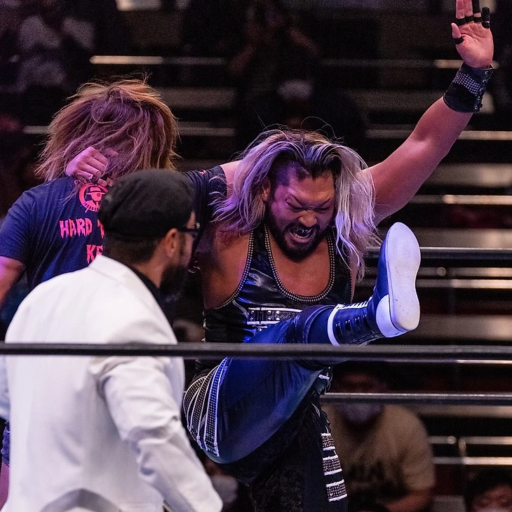 Насколько я понял, тандем Уилла и Хана называется Imperia. Би Пристли, кстати, сопровождала Оспрея по пути к рингу, еще и чемпионство SWA с собой прихватила. Внезапно, но вполне объяснимо, Казучика налетел на британца еще до гонга. Так они и продолжили драться за пределами ринга, оставив четырехугольник ШО и Хану, и второй довольно быстро захватил контроль. Довольно долго «High Voltage» мучился, пока не поймал Великого гарпуном, отправив в бой Окаду. Тот провел несколько излюбленных атак, пока Хан не отбился, проведя дропкик в лицо Казучике, подвешенному на углу ринга. Потом ему досталось еще и от Уилла, пока некогда товарищи по CHAOS не начали обмениваться ударами предплечий, и британец попал под DDT с последовавшим Money Clip, от которого его спас напарник, за что был послан за пределы ринга. Уйдя от Томбстоуна и немецкого суплекса, Оспрей попал под дропкик, и в ринг вернулся ШО, сумевший даже поймать чемпиона RevPro на три немецких суплекса, которых для победы не хватило, и суперкик Уилл пресек, нанеся удар предплечьем в затылок ШО, после чего отвлек рефери, чтобы Би провела некогда подопечному Рокки Ромеро еще и dragon screw у канатов. «Четверка» от Оспрея последовала, Окаде разбить захват не позволил Iron Claw Slam, и ШО ничего не оставалось, кроме как сдаться.