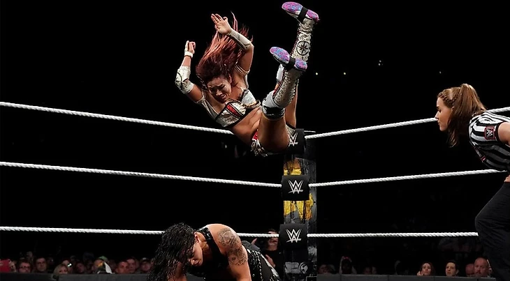 Я не хочу верить, что Каири завершила карьеру, поэтому внес ее именно в эту часть списка. Итак, к делу. Один из самых зрелищных локтей из всех принадлежит именно бывшей представительнице Stardom. Вроде бы это обычный Diving Elbow Drop, но благодаря своей невероятной пластике и контролю тела Сейн добавляет свой особый стиль к финишеру. Очень красиво, тут больше нечего сказать.