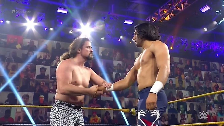 — И вот своё долгожданное возвращение совершили The Bollywood Boys (которым очень был рад Найджелл МакГиннесс, пританцовывая их музыкальной теме с очень позитивным настроем). Самир и Сунил были очень рады снова вернуться на 205 Live, чтобы показать почему они являются лучшей командой бренда и также чтобы показать как должны сиять звёзды. А именно - Свет. Камера. Экшен по-болливудски. На этом их выступление перед "публикой" закончилось (Очень было это дело кратким, но теперь оригиналы в полном составе и должны уже постепенно двигаться к новому объединению между собой).