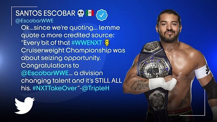 — Между тем нам показали твитт Трипл Эйча о Сантосе Эскобаре, в котором он более-менее позитивно высказался о чемпионе. Также нам показали кадры с концовки командного матча 3 на 3, который прошёл 2 дня назад на NXT. Тогда Джейк Атлас слишком отвлёкся на Сантоса Эскобара после своего финишера, но не успел спасти свою команду от поражения, которое Мендоза и Уайлд в командной связке добыли себе через Ашанте Адониса (Похоже что Эскобар захочет очной встречи с Атласом, который можно сказать чуть не убил чемпиона);