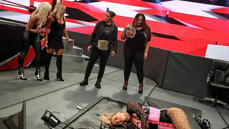Руководство и те, кто уже попали в команду RAW остались смотреть за действием на рингсайде. Бой начался, и все, кроме Ланы оказались за пределами ринга, и шоу ушло на рекламу. Вернувшись с нее мы увидели, как Никки страдает в болевом на руки с использованием канатов от Пейтон. Ну и нам показали, что Найя заняла кресло Байрона Сэкстона, в то время, как все остальные так и остались стоять. Ройс тем временем после серии реверсов отправила Лану плечом в рингпост и сбросила Эванс с апрона, чтобы попасть в сворачивание Никки до 2, чтобы потом провести клоузлайн в полете также до 2. От болевого Кросс отбилась, впечатала австралийку лицом в тернбакл, проведя лане слэш с апрона и seated senton на рингсайде. Эванс получила tornado DDT, и Никки вернулась в четырехугольник с помощью хай кроссбади до 2. В следующем эпизоде Лана поймала ее хай киком на апроне, устроила обмен реверсами и получила Woman's Right от Лэйси, которая попала в сворачивание до 2 от Кросс. Разбила пинфолл Ройс, провела кик Эванс, Gory Bomb Никки прямо на Лэйси, однако и этого для победы не хватило. Потом Кросс отбилась от попыток суперплекса и Пейтон, и Эванс, причем не единожды, и все это вылилось в Tower of Doom между тремя девушками… и Лана выкинула Пейтон за пределы ринга, удержав Никки до 3. Джэкс поздравила победительницу, обняла ее, и… приказала Шэйне подготовить комментаторский стол. И Лана, конечно же, получила самоан дроп на этот самый стол. Уже в шестой раз, если верить комментаторам.