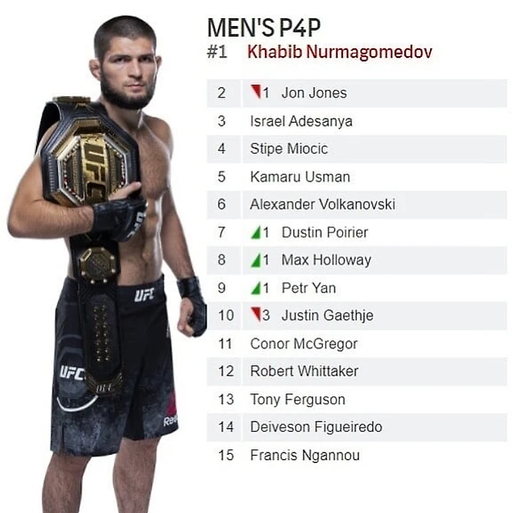 Но даже несмотря на эти пункты рейтинг P4P все равно очень абстрактный, особенно в смешанных единоборствах. Довольно сложно сталкивать бойцов, представляя их в других категориях. Думать, сохранят ли они силу и выносливость, будь тяжелее, или смогут также нокаутировать, если вес будет меньше. Но в любом случае, кандидатов на лидерство в UFC трое: Хабиб, Джон Джонс и Исраэль Адесанья. Чемпион среднего веса еще слишком мало дерется в промоушене, чтобы возглавлять список, поэтому остаются Хабиб и Джонс, которые рубятся за первое место с прошлого года.