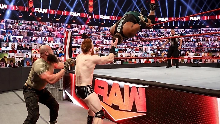 А вот это уже реально лучший матч всего выпуска - три больших парня, не ограниченных в умениях на ринге как силовики и броулеры просто вышли и устроили невероятную мясорубку, угрожая уничтожить не только друг друга, но и всё пространство вокруг себя. Конечно не обошлось без кековых и опасных моментов - как падение Ли во время своей коронной планчи на апрон из-за недолёта в оппонентов, недоколено-недокроссбади от Строумэна у баррикад на Шиму с Китом и Tower Of Doom с участием всех троих, отчего ринг должен был сложится напополам, но обошлось. Плюс все трое обеспечили в матче хороший темп, динамику и отличный экшен между собой. Хоть это и заняло всего 11 с чем-то минут, но рестлеры отлично поработали, а я убедился в потенциале противостояния между Ли и Строумэном, которым WWE не дают пространства для отличного очного поединка.