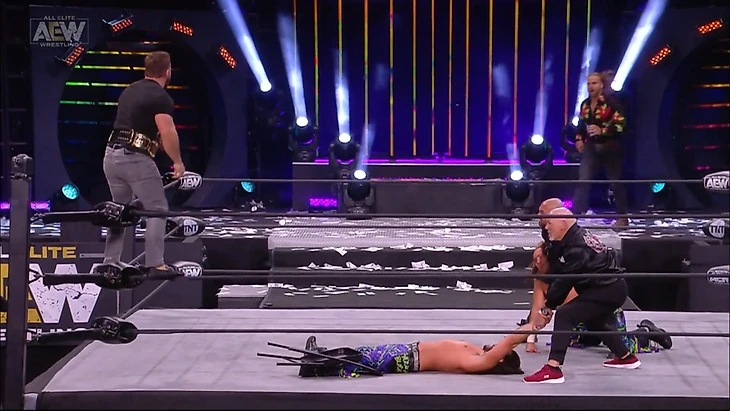 Сразу после гонга на ринг влетают FTR. Сладкоголосый Дьявол Дэкс Харвуд в компании с Кэшем Уиллером и Тулли Блэнчардом хотят довести начатое две недели назад до конца. Они снова зажимают ногу Мэтта стулом, планируя навсегда вывести его из боя. Но внезапно им на помощь прилетает Адам Пэйдж со своим неизменным вискариком, а следом и Кенни Омега.