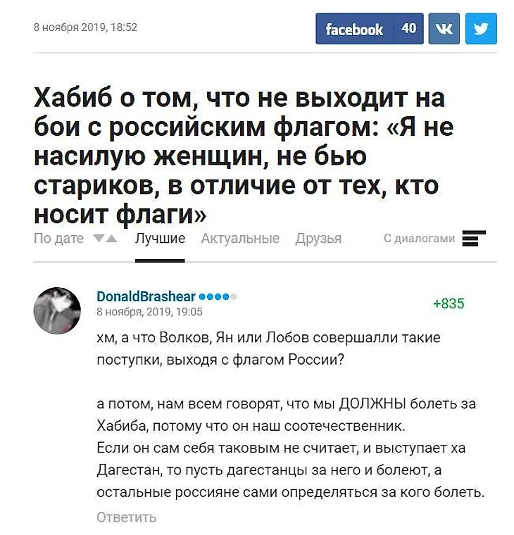 Честно, довольно долгое время, я относился к нему нейтрально. Но после истории с Артемом Лобовым, я стал в некоторой степени его хейтером. Ну или нацистом, по мнению некоторых. Для меня не понятным было то, почему он не выступает с флагом России, например. Или отмененный бой с Тони Фергюссоном из-за того, что Хабиб не мог сделать вес и специально сбежал в больницу, не поставив в известность ЮФС. Или вот, его трусливое поведение в том самом автобусе, когда пришла пора отвечать за свой поступок.