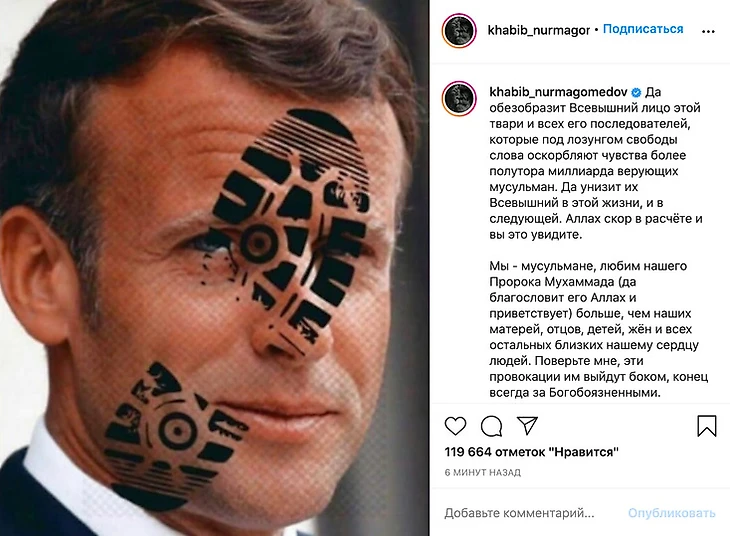 30 октября, после двух фактов ужасного насилия во Франции, Хабиб Нурмагомедов опубликовал серию постов в Инстаграм, направленных против высказываний и действий (а были ли они вообще?) президента Франции Эммануэля Макрона.